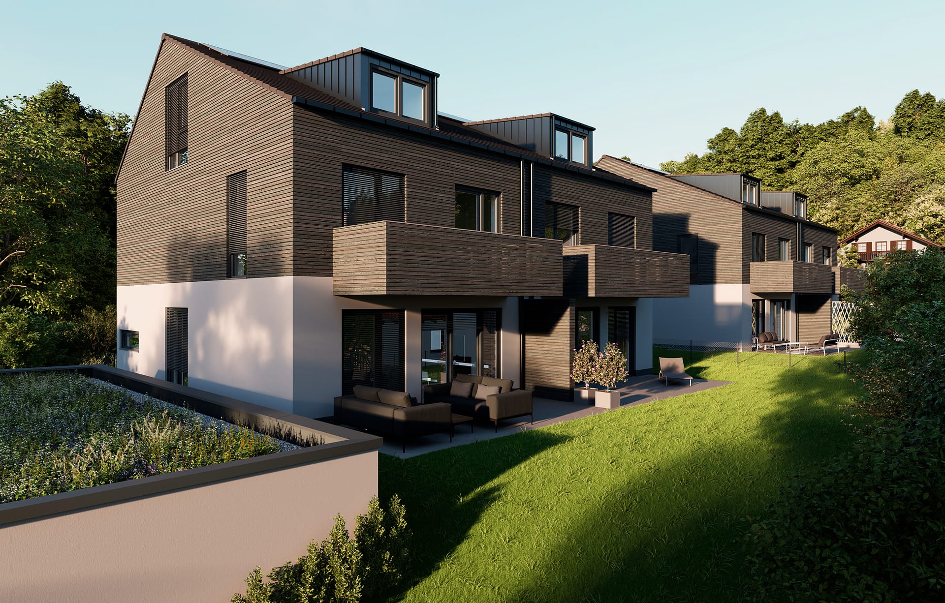 Die ideal ausgerichteten und real geteilten Grundstücke bieten viel Freiraum und Gestaltungsmöglichkeiten. Alle Häuser sind voll unterkellert und erstrecken sich über Erdgeschoss, Obergeschoss sowie ausgebautes Dachgeschoss. Die Terrassen- und Gartenflächen laden zu entspannten und erholsamen Stunden im Grünen ein. Die moderne Ausstattung garantiert hohen Wohnkomfort. Große Fensterflächen beziehen dabei das natürliche Umfeld ein und lassen die Übergänge vom Innen- zum Außenbereich fließend erscheinen.