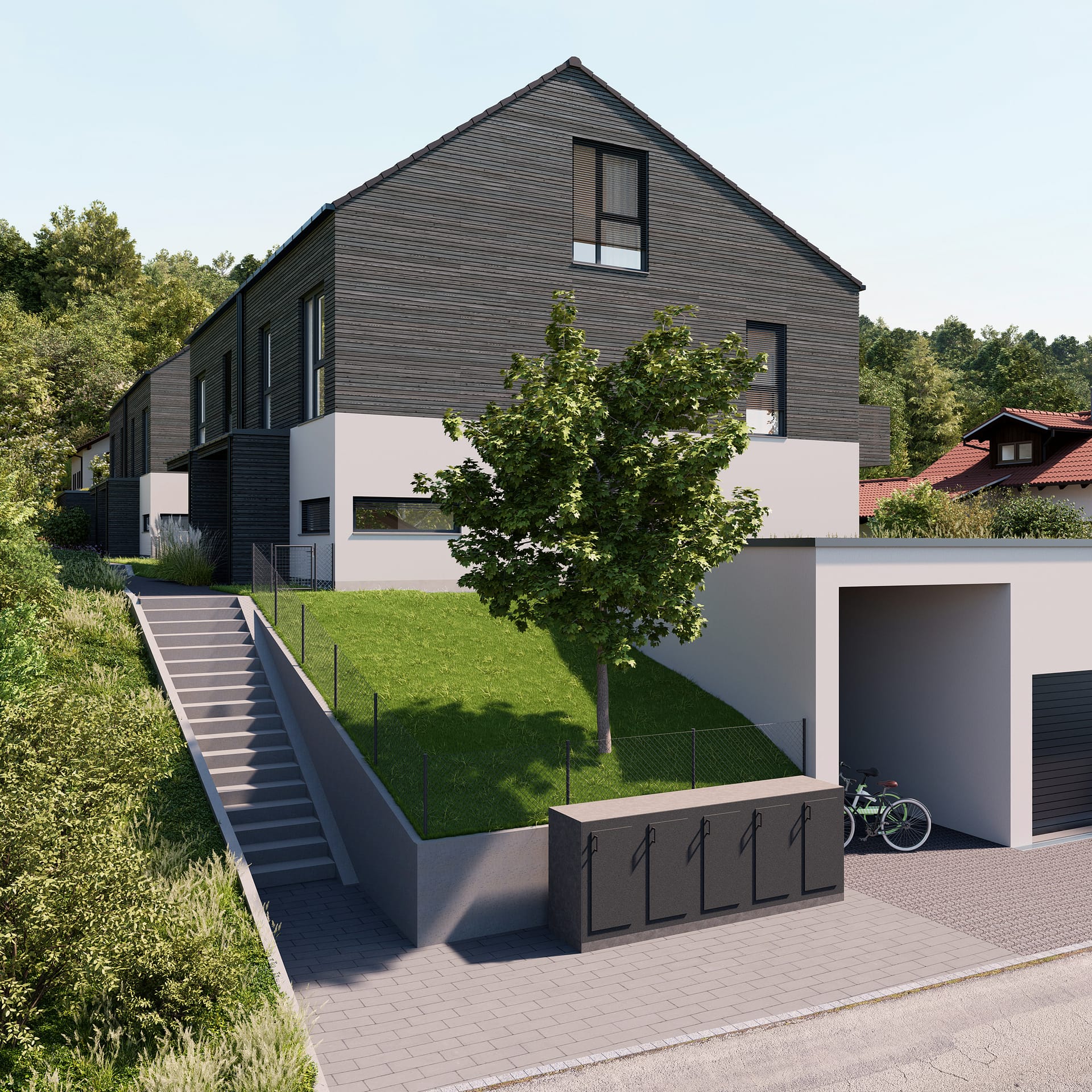 In idyllischer Lage auf einem großzügigen Areal von etwa 1.100 m² entstehen die sonnenverwöhnte Doppelhaushälften, perfekt für Familien. Die Umgebung zeichnet sich durch eine ansprechende Mischung aus Einfamilien- und Doppelhausbebauung aus.